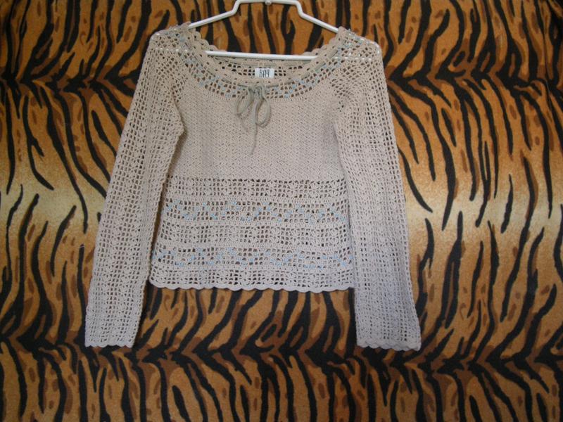Шикарная ажурная кофточка бежевого цветавырез на шее,низ рукавов,низ кофты-вывязаны красивыми зубчиками,фирменная,натуральная-100%коттон,на груди стягивается кожаным шнурком,украшения в виде бирюзовых бусинок,объем груди-80см.,длина рукава от шеи-63см.,длина кофты-48см.