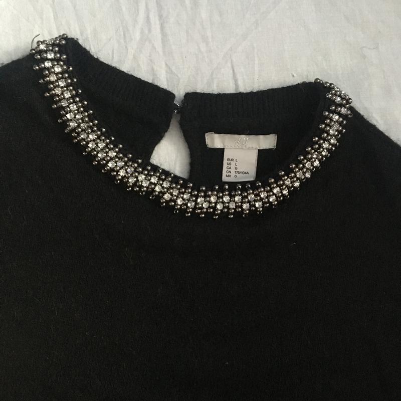 Свитерок в идеальном состоянии, все камушки на воротнике на месте. По бирке размер L, но будет хорошо и на М. В составе шерсть, очень тёплая.
