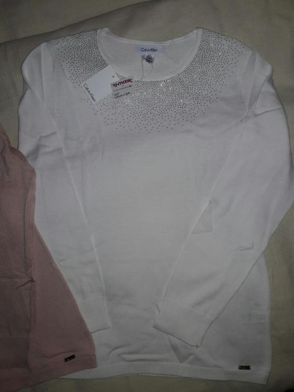 нарядный свитер Calvin Klein Белый размер L. На груди стразы . Очень классный.Оригинал куплен в Америке в магазине TJ maxx НЕ онлайн. БЕЛЫЙ - полуобхват груди 50-50.5см, плече 10см, рукав от плеча 62.5см, длина от плеча 68см.