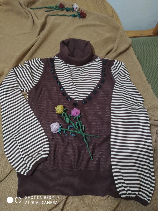 Якісна річ на осінню прохолоду. М'який і приємний трикотаж,не тонкий,шось схоже на віскозу і шерсть,практично новий. Висока подвійна горловина18см,можна робити подвійний підворот.Рукавчик буфиком,до низу розширений,манжетик-резинка.Перед декорований трикотажнлю сіточкою,що створює ілюзію жилетки. Бірочки відсутні,зорієнтуйтесь по замірах: довжина-52см, рукавчик-56-64, ПОГ-42см, по плечах-33см