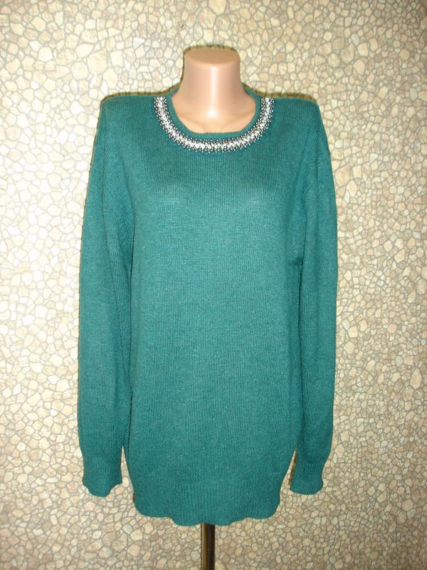 Свитер с камешками "ATMOSPHERE" 51% nylon 49 % acrylic Мягкая приятная нитка,хорошо тянется. Указан размер 16 р Смотрите в сантиметрах в моем описании. Ширина плеч 51 см Пройма 28 см ПОГ 60 см ПОТ 57 см ПОБ 58 см ПО низа 48 см (резинка тянется) Длина рукава от горловины 80 см ( от плеча 63 см) Длина спинки 66 см