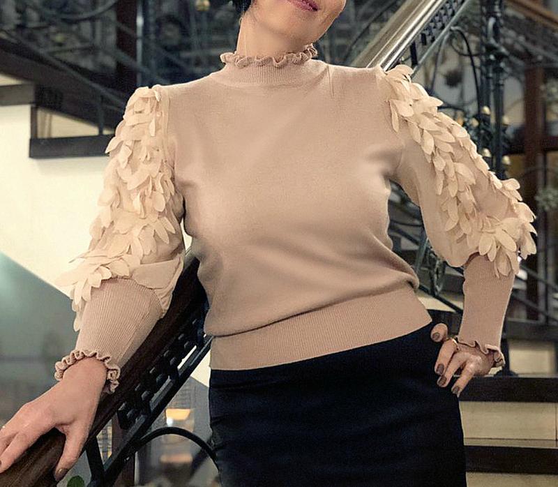 Очень красивый свитер с интересными рукавами мерцающей о цветах, рр-S, небольшая M, качество - супер) 100% оплата на карту
