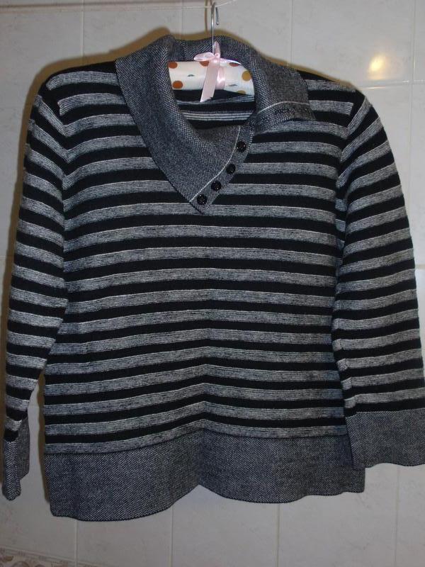 Свитер из стриженой шерсти, размеры - ширина плеч - 39 см, ПОГ - 46 см, длина по спинке - 51 см. Горловину можно оформить двумя способами, регулируя застегиванием пуговиц.