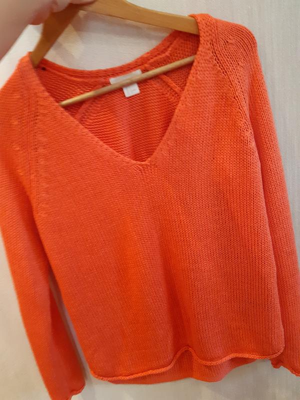 Теракотового кольору кофтинка, з v-подібним вирізом, підкреслює лінію шиї, розмір S, на рост165, ПОГ 47см, довжина по передній поличці 54см, за задней64см