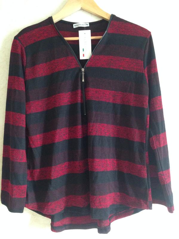 Новый, со всеми бирками. Всегда модная полоска, горловина оформлена молнией, которой можно регулировать глубину выреза, трикотаж вязаный. Размер указан S/M. Длина 64/66 см ПОГ 51+, линия низа 57+, линия плеч 39 см длина рукава 54 см