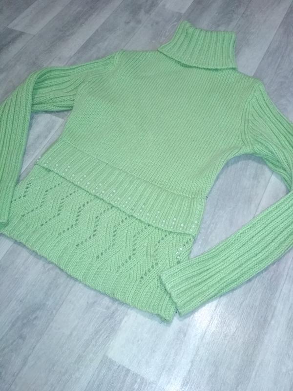 Кофта женская вязаная салатовая с бусинками. Замеры: плечи 34 см, пог 43 см, рукав 60 см, длина 51 см, высота воротника 18 см. Есть катышки.