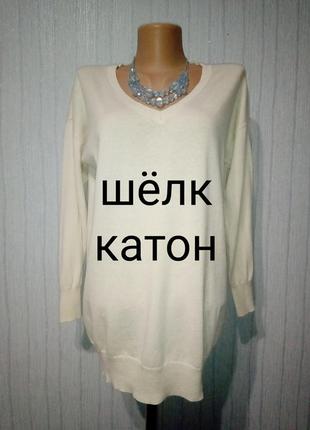 очень нежный свитерок, жемчужного цвета. Супер состав 52% шёлк, 13% Котон. Спущенная линия плеча. Плечи 54, пол груди 51, длинна 70, рукав от горловины 63. Размер М.Состояние очень хорошее, без дефектов.