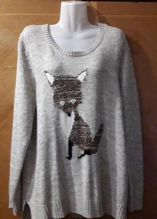 Мягкий. и приятный на ощупь. свитерок. Спереди рисунок лисы , связанный нитью с маленькими блестящими пайетками. Трикотаж средней толщины. . Спереди короче. На бирке размер 20. Длина по спине 72см. Длина от подмышек 52см, включая разрез по бокам 10см. Длина спереди по средине 60см. Спереди длина от подмышек 47см , включая разрез 9см. Плечи 11см. Рукав 67см. Полуобхват груди 64см. Полуобхват по низу (резинка) 54см. Полуобхват бёдер тянется до 74см. Состав на фото. Камера искажает цвет,ближе всего третье фото. Смотрится СУПЕР красиво и современно. ❗Доставка Новой или Укрпочтой за счет покупателя. ❗Отправляем после полной оплаты на карточку Приватбанка. ❗Возврата и обмена нет. *01332*