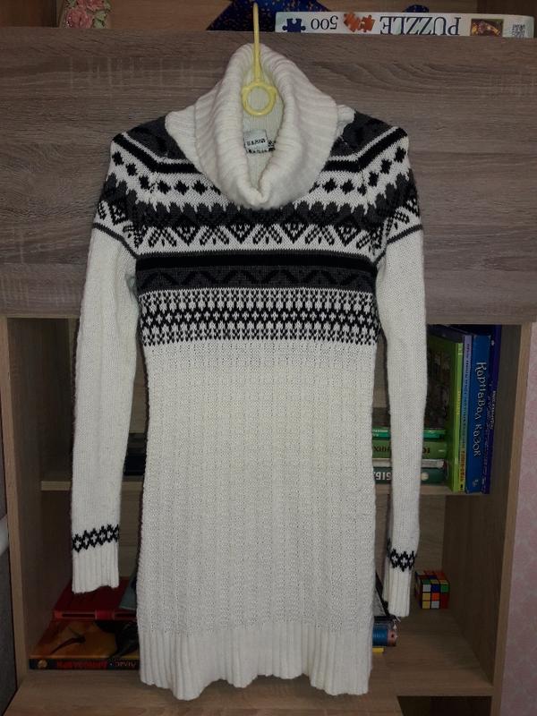 Теплая длинная кофта. Рукава и нижняя часть выполнены более тонкой вязкой. Воротник теплый, заворачивается. Носилась оккуратно, пятен или других дефектов нет. Запаха нет.