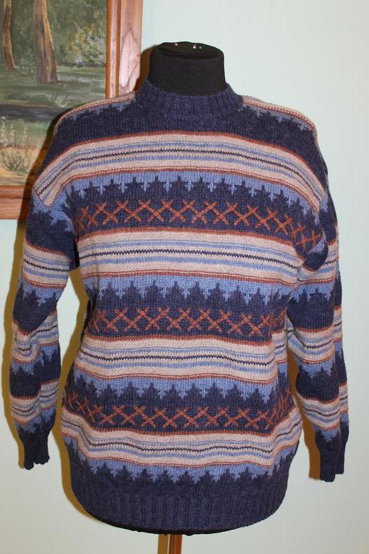 Нова кофта з шотландської пряжі, вироблено в Італії.Придбана в Європі. Довжина-68см, плечі-55см, рукав від плеча-60см(фасон з опущеними плечима,рукав від горловини-78см),від підмишки до підмишки-64см,півоб'єм низу-46см.