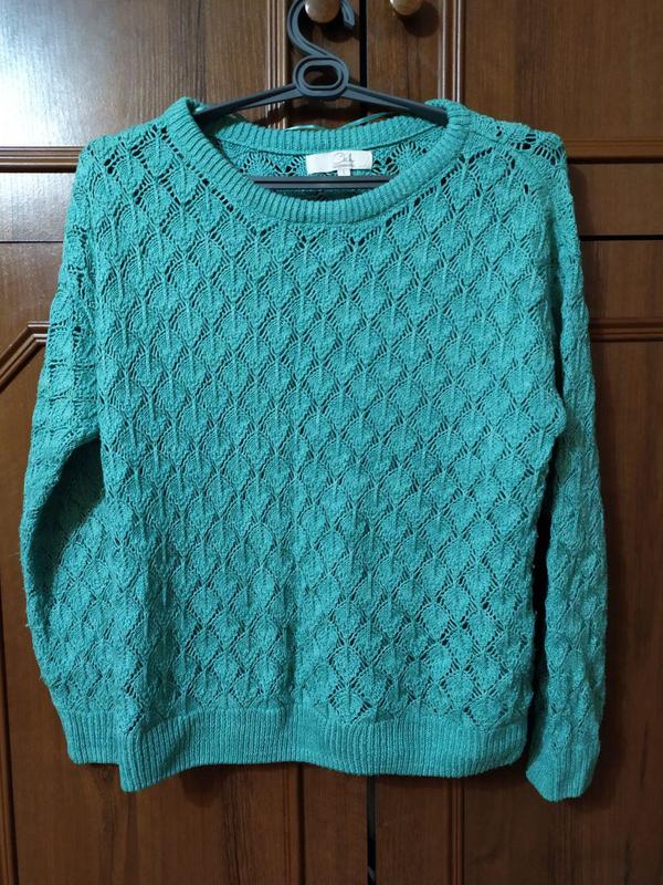 Бирюзовый свитер от Clockhouse.Размер L, можно на М если любите посвободней. Цвет удачней всего получилось передать на 3м фото.