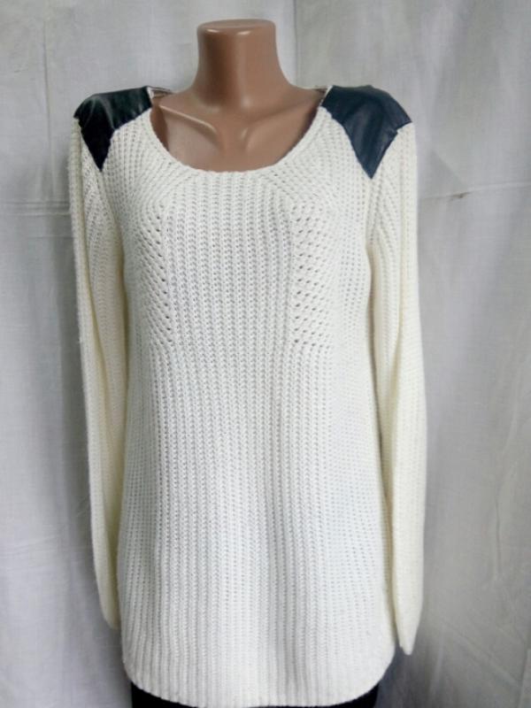Белого цвета с чёрными плечиками (Эко кожа). 100% акрил Длина 77 см ПОТ 52 см Плечи 45 см Длина рукава 67 см Модный и стильный свитерок. Смотрите мои другие объявления Отвечаю быстро отправка Укр или Новой почтой