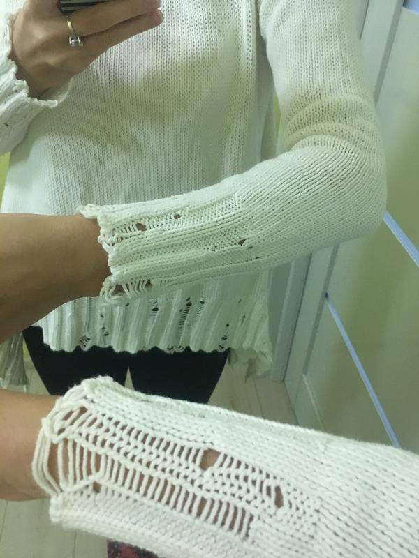 Стильный свитер с декоративными дырками. В отличном состоянии, одевался несколько раз, оригинальная модель. Размер на s - owersize, подойдёт на m и даже l. Фирменная, качественная вещь. Цвет белый, камера искажает.