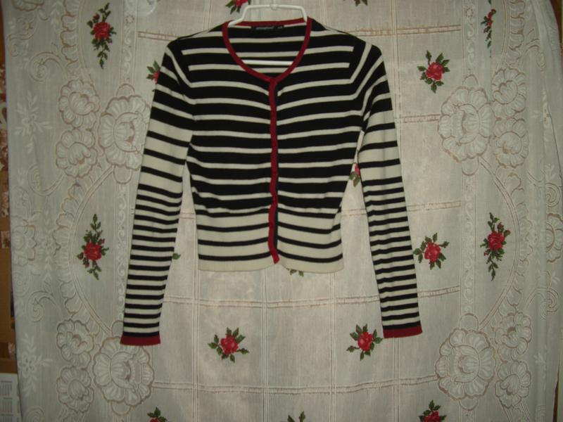 Шикарная ,фирменная,натуральная кофточка в черно-белую полоску,80%коттон,18%нейлон,2%эластан,вырез вокруг шеи,впереди по центру,низ рукавов-узкая красного цвета манжет-резинка,застегивается впереди на красные пуговицы,объем груди-84см.,длина рукава-62см.,длина кофты-49см.