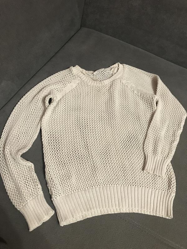 Летний котоновый свитер, сетчатая вязка. Красивый бежевый цвет. Очень хорошее состояние. Размер S. Длинна рукава - 60см, длинна по спинке - 52см.