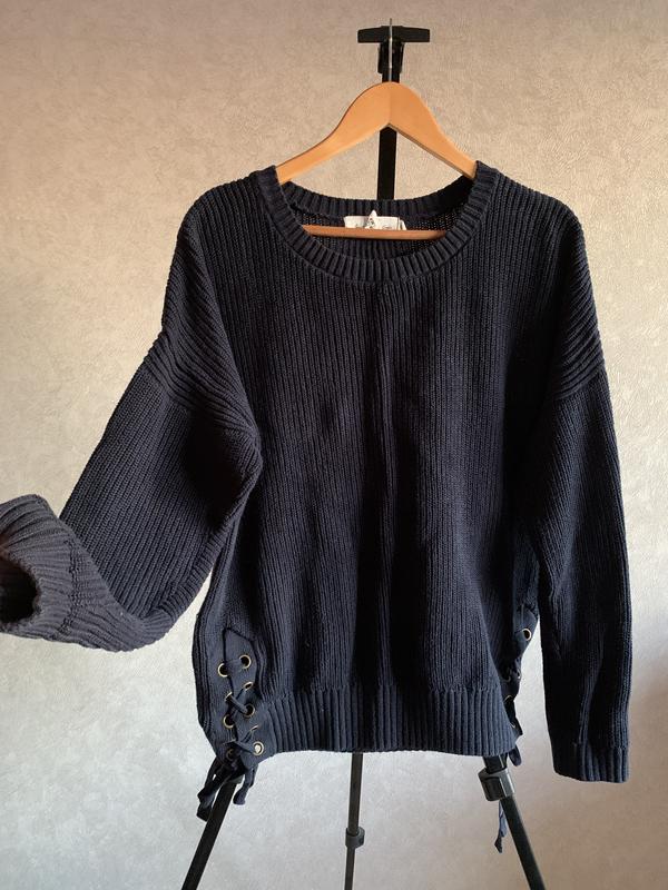 Коттоновый свитер темно синего цвета. Декорирован люверсами на завязках. Размер М,L.