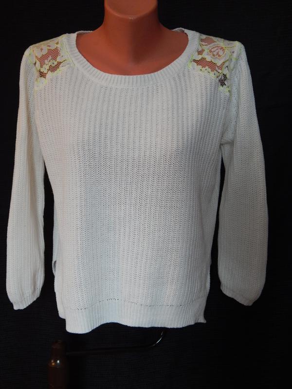 Белоснежный свитер.В отличном состояние.Затяжек и изьянов нет. Размер 36. длина спереди-53см длина по спинке-56см полуобхват груди-54 длина рукава-48см ширина по плечам-43см