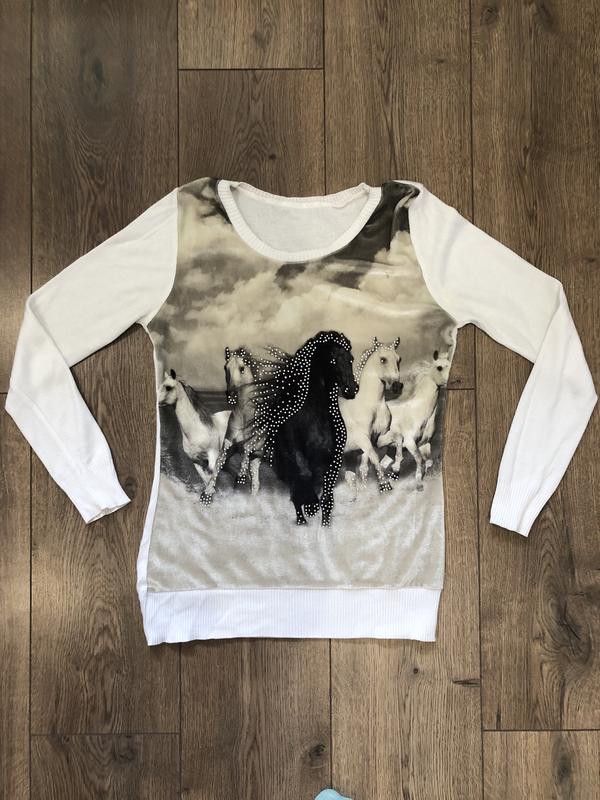 легкий свитерок на размер S, перед велюровый, стразы держатся хорошо длина 60 см, об груди 40 см, длина рукава 58 см
