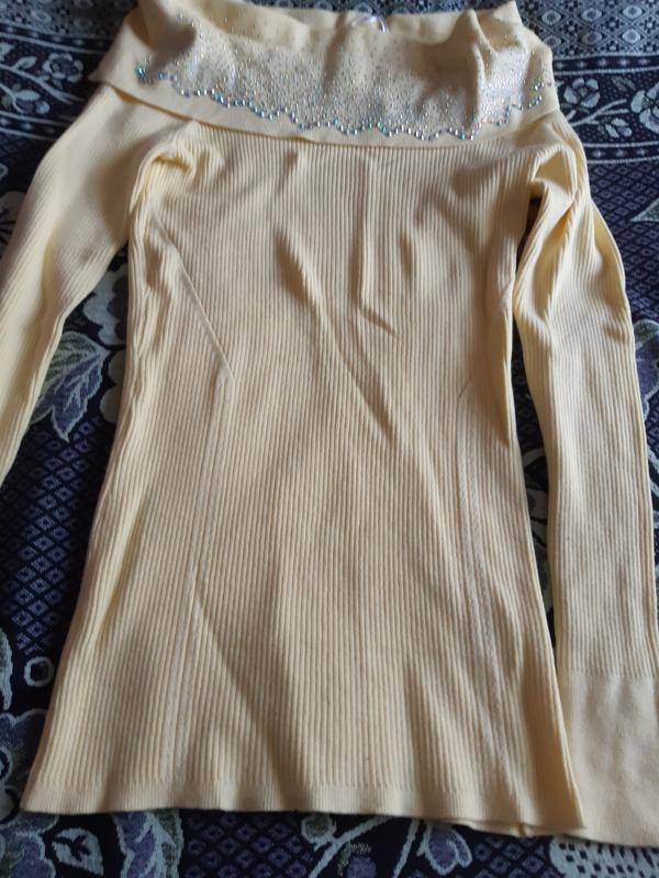 Кофтинка з цікавим коміром, насичено лимонного кольору ( на фото не відповідає дійсності). Довжина 52 см , рукав 46см ( по внутрішньому шву), ПОГ 33 см всі заміри не розтягнутому виді, як на фото. Підійде як на 44 розмір так і на 48 .