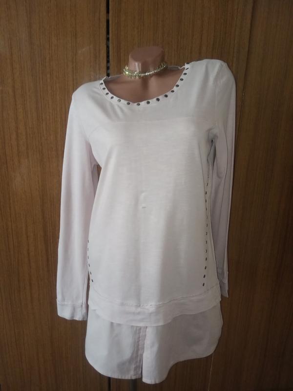 Хорошенькая вещичка. Тоненький трикотаж. Внизу рубашечная ткань. Украшено заклепками. Спинка немного длиннее. Цвет пепельно розовый ОГ 102-108 см ОТ 100-106 см ОБ 104-108 см Рукавчик 61 см Длина 76-79 см
