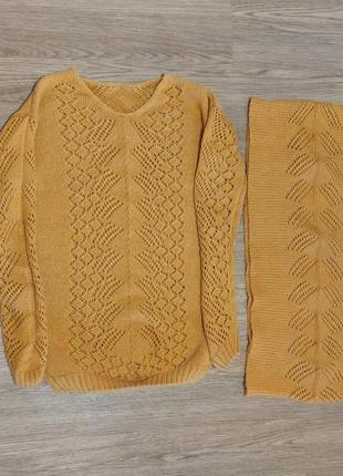 Дуже гарний ажурний светр гірчичного кольору , в комплекті шарф, дуже теплий, вовна