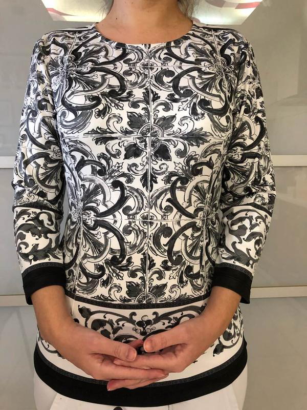 Кофта шикарно виглядає і відмінно сидить на фігурі. Стильний принт по всій кофті, рукав 3/4. Склад: 95% поліамід, 5% еластан. Розмір 34 італійський, S-M, по довжині 63 див., по плечах 38 див., обєм грудей 80 див, довжина рукава 44 див. Нова, без етикетки. Розумний торг доречний.