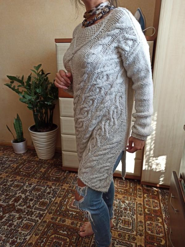 В идеальном состоянии. Асимметричная форма вязки: с правой стороны 70 см, слева- 80 см, ОГ 52 см, рукав от шероины 68 см. Мягушка и тепленькая😊