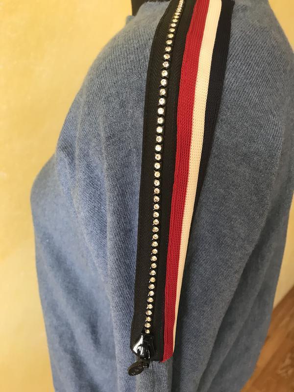 Свитер с лампасами , замочками и камешками на плечах . Размер указан L/Xl . Состояние идеальное, дефектов нет. Реальный цвет на первых трёх фото Длина изделия 76 см, рукав от ворота 69 см, ПОГ 54 см, ПОТ 50 см, ПОБ 54 см , все замеры не в натяжку тянется.
