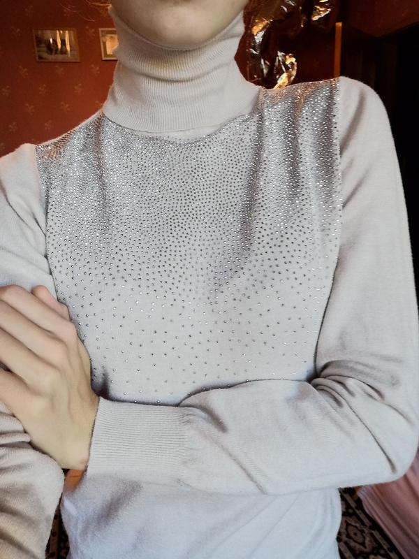 Гольф бежевого кольору в ідеальному стані. Розмір м-л. 40% віскоза, м'який і приємний до тіла. Верхня частина в блискітках. На фото одягнутий на хс, добре тягнеться.