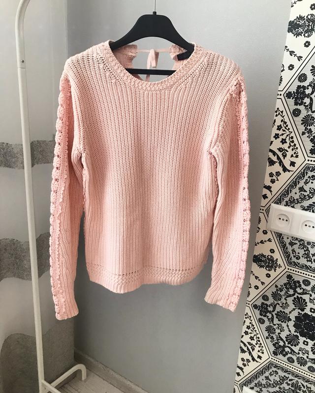 Стильний світер ніжно рожевого кольору { машинна в’язка}. На рукавчиках та по боках вибито квітковий орнамент. Довжина 53,5 см, рукав 60 см, ОГ 43 см.