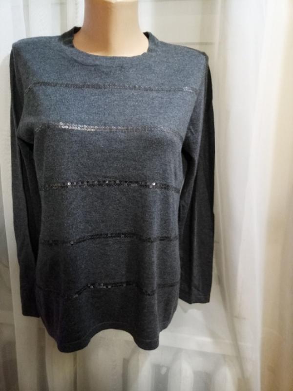 серый с пайетками, размер М, замеры плеч 35, грудь 46, талия 48, длина 59, рукав 56,тоненький, кашемир