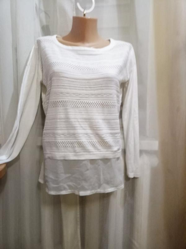 колір білий , шифон під низом имитауия сорочки, розмір 36-38замеры: плечі 41,рукав-54,загальна довжина 59,довжина по в'язці 49, груди 48
