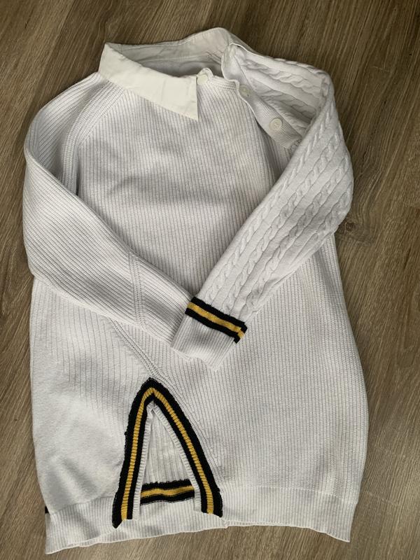 Свитер одевала пару раз. Состояние идеальное. Воротник как видите из коттона. Цвет воротника и пуговок отличается от цвета вязки. На фото видно. Подойдёт на размер с -м