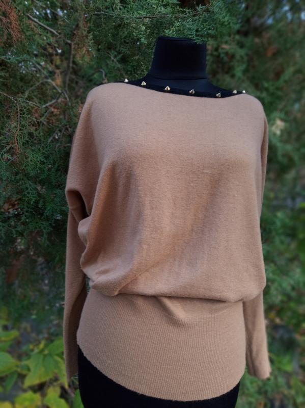 Классный свитер из шерсти ламы, удобный крой летучая мышь. Оригинальные шипы в плечах и лампасы по бокам плеч. 5,7 фото маленький шов нити ткани такого цвета, это не дефект. ПОГ 67 ПOT 45 ПОБ 30 Длина рукава от плеча 61 Длина свитера 68 Ориентируйтесь по замерам