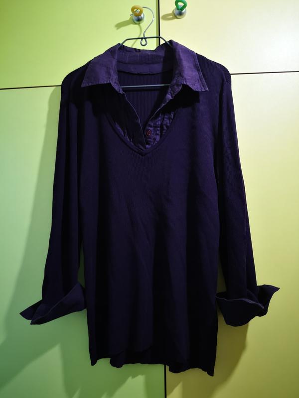 Кофта 2 в 1 - имитация рубашки под кофту, рукав 3/4 с отложным манжетом. Цвет насыщенный, очень сочный такой виноградный. Состав - 62% вискозы, 38% полиамида.