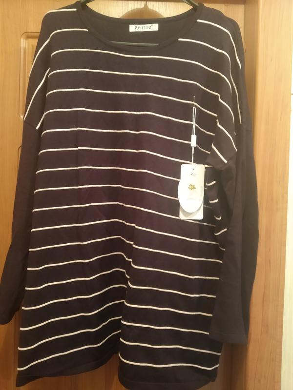 Свитер темно синий цвет, спереди розовые полоски.Длина 75 см. Ширина 60 см.