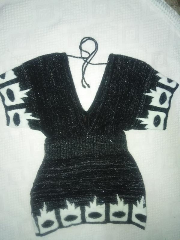 Очень тёплая, вязаная чёрной и серебрянной нитью с белыми узорами, на лопатка завязочка🙂