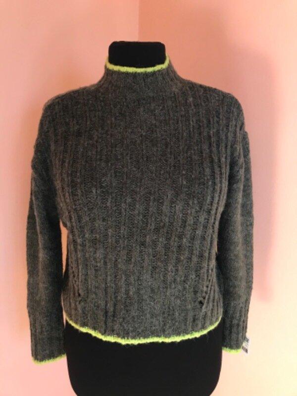 Класна кофта фасон оверсайз, розмір М вказано, складники: 20%- нейлон, 80%- лана. Довжина- 50см, плечі-54см( приспущені по фасону), рукав від плеча-55см( тобто рукав від горловини- 70см получається), пог- 58см, півоб‘ємнизу-53см.