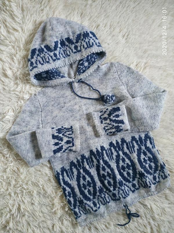 ручная работа вязался на заказ,очень теплый,нитка отличного качества не кашлатится и не растягивается пол груди-47 тянеться длина 57