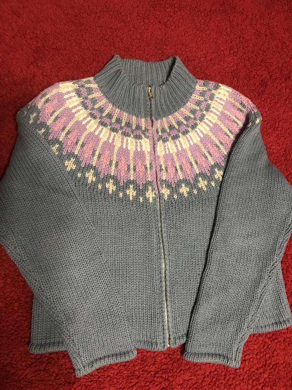 Свитер на змейке с узорным орнаментом 100% акрил.Длина 55 см;ширина 48 см; реглан рукав 71 см;ширина низа 52 см.