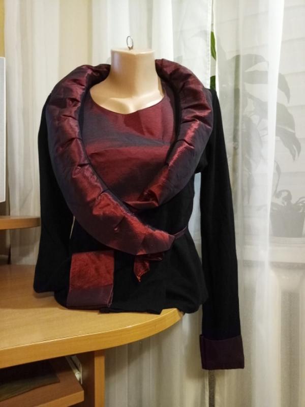 очень красивый цвет атлас стрейчевый, пиджак черный трикотаж -отделка атласом с поясом, размер 36-38,замеры маечка:плечи 34, 5,грудь 42,талия 40,длина 52, 5. пиджак плечи 40,рукав 64, 5,длина 55,обьем 41