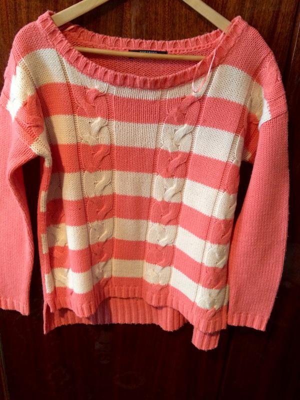 Теплий светр, під в' язку. Ззаду довший аніж спереду. Розмір пише S, але абсолютно нормально буде і на М. Довжина спереду 51, рукав 50 см. Одягнений один раз.