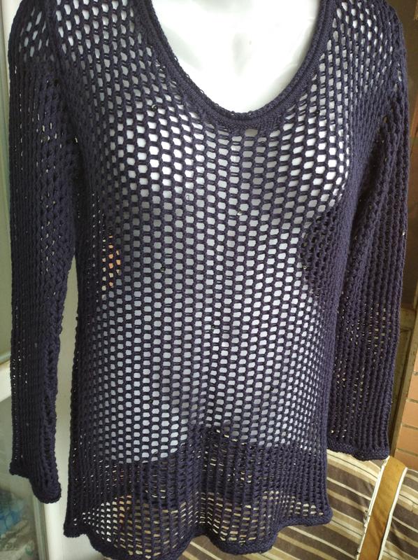 Свитер связан сеткой, вязка машинная, напоминает рыбачью сеть, глубокого красивого темно-синего цвета.В комплекте идет майка. Можно носить с майкой, можно без, можно майку отдельно надевать под что-либо, короче три варианта ношения. Размер варьируется от 48 до 54. Смотря кто как носит. . Длина изделия по спинке 73 см. рукав длиной от горловины 73 см. Покупала в интернет-магазине Бон Прикс за 350гривен при долларе 8 гривен, цена получается была 45 долларов. Ни разу не носился, новый абсолютно. В комплекте идет майка. Можно с ней, можно под шикарный бюстик без нее. Можно майку отдельно.Как вариант, думаю, что можно даже надевать верхнюю сетку летним вечером на отдыхе, на купальник. Майка довольно длинная по середину бедра из плотной вязки. Замеры: Длина изделия по спинке 73 см. ширина изделия ПОБ 42 см. плюс очень сильно может потянуться,до 60 см ,может быть в обтяг по фигуре, а может свободно рукав длинной от горловины 73 см. Брала за 350 при долларе 8 грн. Получается его цена почти 50 долларов. Состав: 70% полиэстер, 30% вискоза