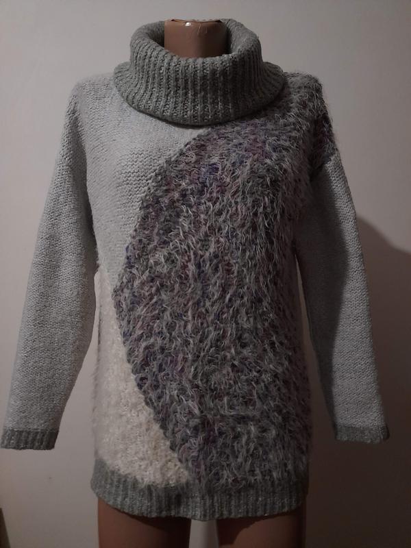 Мягкий свитер с с пушистым декором, объёмный воротник, спущенный рукав.. Состояние очень хорошее. Грудь 57, длина 61, рукав 65, низ 52.