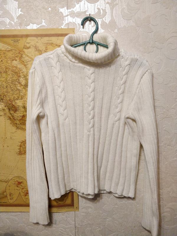 Минималистичный укороченный свитер с узором косичкой. Длина по спинке 52 см, ширина 42см, рукав от плеча 59,5см