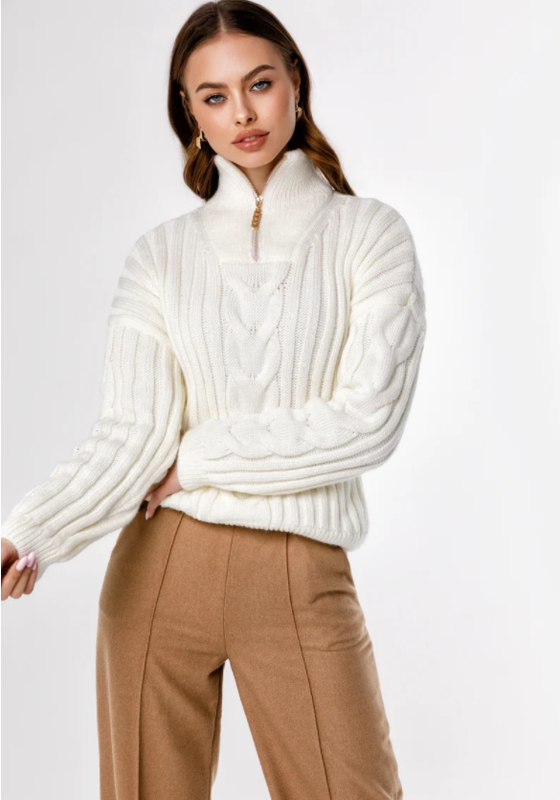 В SS’2020 свитер на молнии, как на моделях Isabel Marant, Jacquemus, Proenza Schouler, станет стильной альтернативой классическому пуловеру. Модель с крупными арановыми узорами спереди и на рукавах выполнили из теплой пряжи из смесовой шерсти. Материал: вязка Состав: акрил 50% шерсть 50%