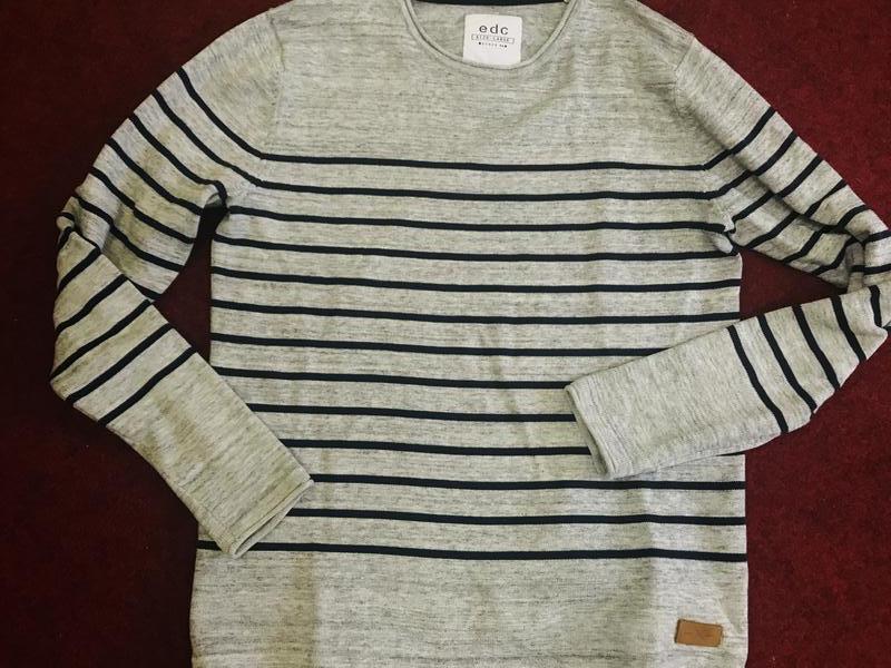 Сірий в чорну смужку светр EDC. Розмір вказано L . Стан ідеальний Довжина виробу 69 см, рукав від ворота 80 см, ПОГ 57 см, ПОТ 52 см, ПОБІДИ 53 див.