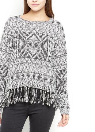Объемный женский свитер с геометрическим принтом и бахромой от New Look. Модель фасона oversize с приспущенным рукавом, удобная и актуальная. В прекрасном состоянии. Размер на бирке - S Замеры: Длина от плеча без бахромы - 53 см Длина с бахромой - ок. 63-64 см Длина по центру спинки - 56 см Плечи - 70 см Длина плеча - 23 см Длина рукава - 43 см Ширина подмышками - 64 см ПО низа - 60 см. Ткань: 63% хлопок, 35% акрил, 2% вискоза.