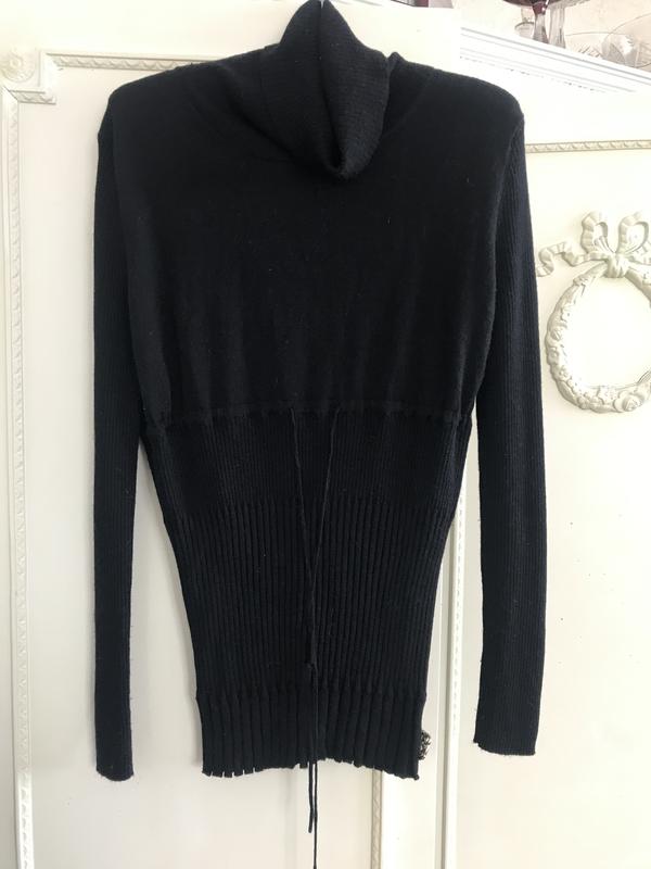 Стильный свитеров из тонкой шерсти от Stefanel. Цвет-чёрный. Состав:шерсть-70/, полиамид -30/. Очень интересный фасон:высокая резинка по талии доходит под грудь, есть утяжка-шнурок, что очень выгодно подчеркивает фигуру. Сама резинка трёх видов:широкая, средняя и под грудью-самая узкая. Рукав также в узкую резинку. Размер по бирке L. Замеры:длина-69 см, ПОГ-46 см, ПОБ -44 см, рукав-62 см.