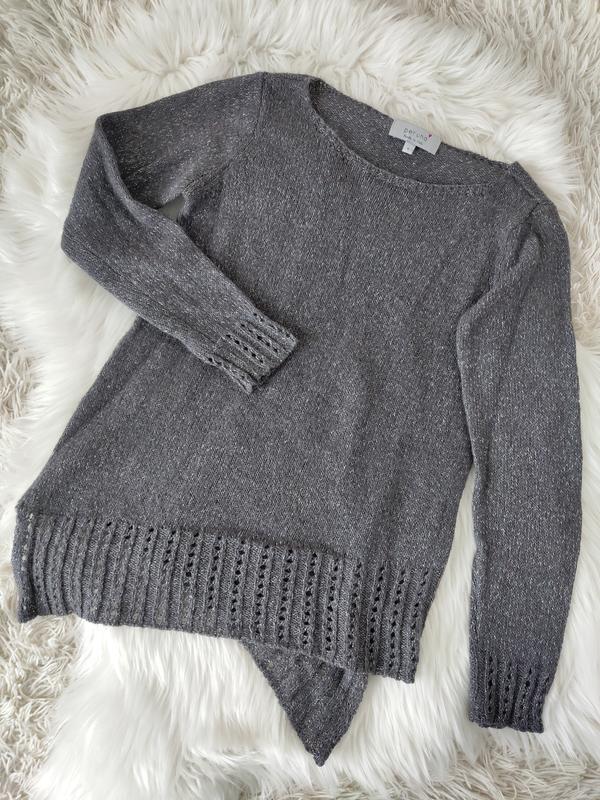 Светрик сірого кольору зі срібною ниткою з декорованим низом та рукавами. В чудовому стані.